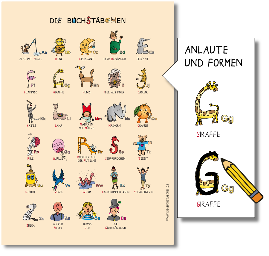 - Poster mit allen Buchstäbchen (Großbuchstaben A bis Z und Umlaute) sowie große und kleine Klarschrift-Buchstaben zur Verdeutlichung neben jeder Abbildung